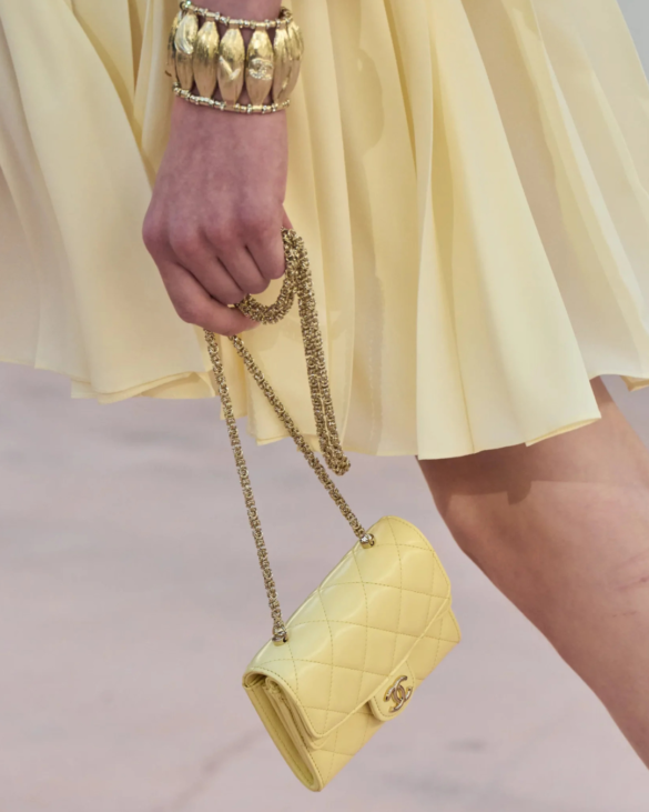 Le passerelle dell’autunno/inverno 2025 sono state un palcoscenico perfetto per l’espressione di questa sfumatura. Chanel, come sempre, ha giocato con la fluidità e la raffinatezza, proponendo abiti plissettati e tailleur morbidi che evocano l’immagine di una giovane donna in vacanza a Deauville, immersa in una bellezza senza tempo. La maison ha messo in scena un look rilassato e sofisticato, dove il giallo burro si fondeva perfettamente con l’idea di una eleganza senza eccessi.